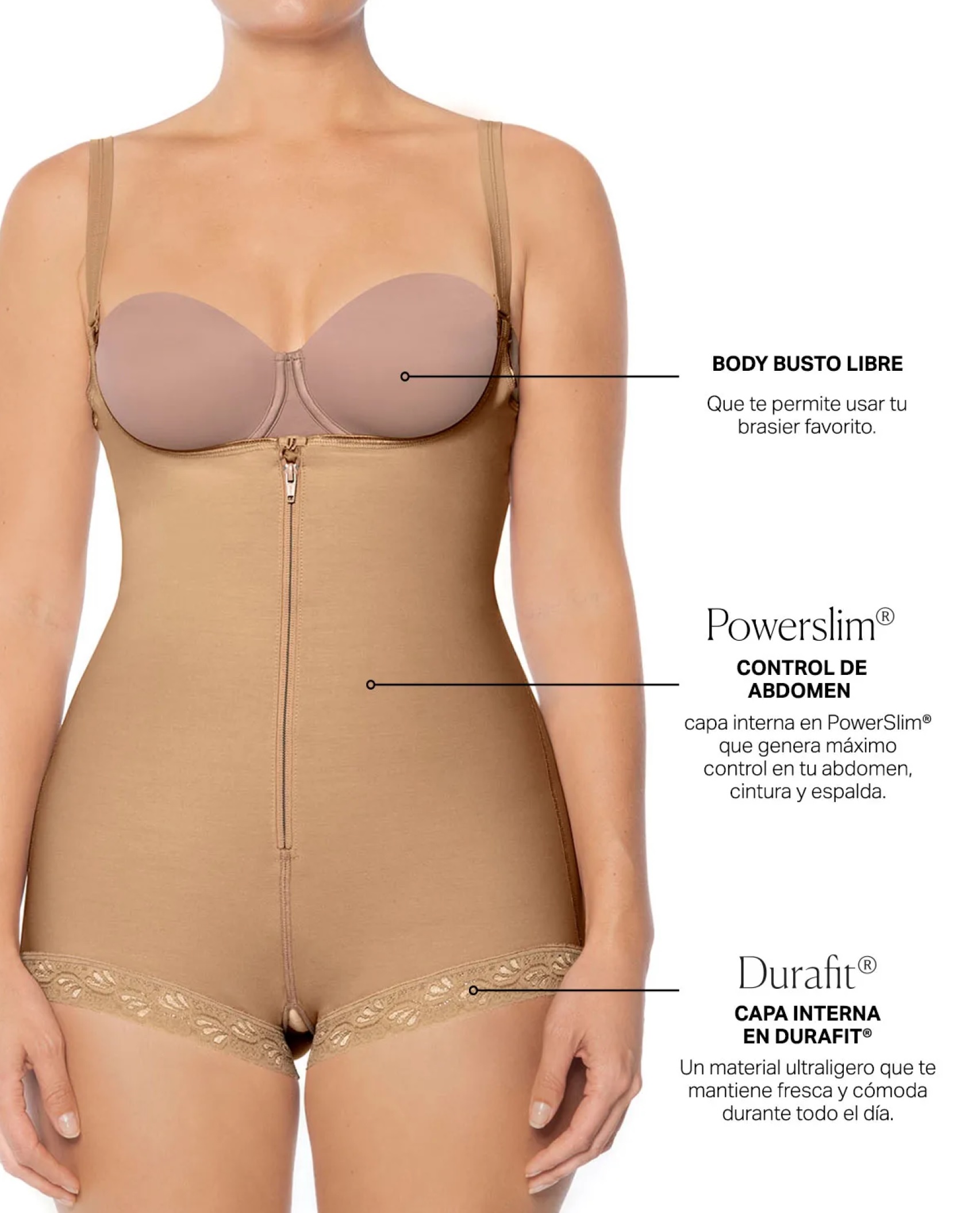 Está especialmente diseñada para moldear y controlar zonas específicas de tu cuerpo como: el abdomen, la cintura, la cadera y los glúteos. Tiene costuras especiales que ayudan a darle una forma estilizada a tu figura, especialmente a tus glúteos. Una capa de PowerSlim® en la parte exterior, ayuda a controlar tu cuerpo y tiene una capa interna de DuraFit®: una tela más suave y fresca. Es una faja cómoda, con cargaderas elásticas removibles, un cierre delantero ultraplano que no se marca en la piel ni en la ropa con tres broches internos para facilitar su postura. Es una prenda que puedes usar todos los días o después de un parto.