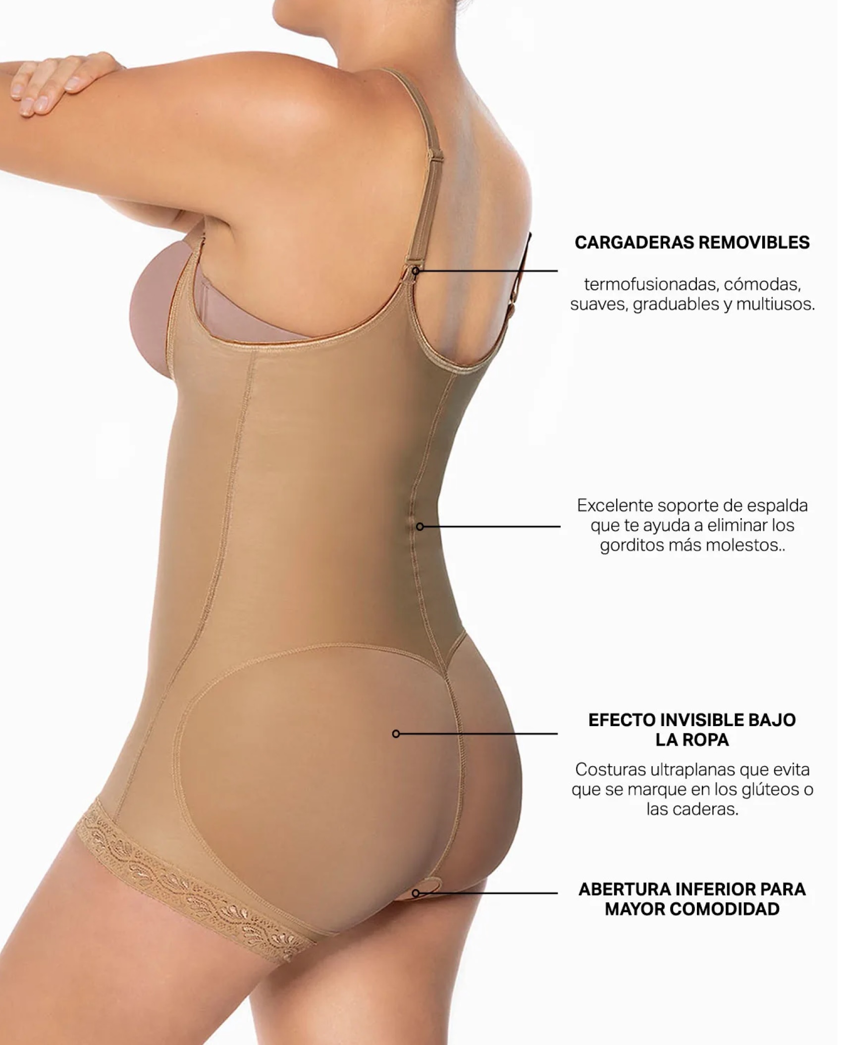 – Cortes y costuras especiales que realzan, moldean y afinan los glúteos.
