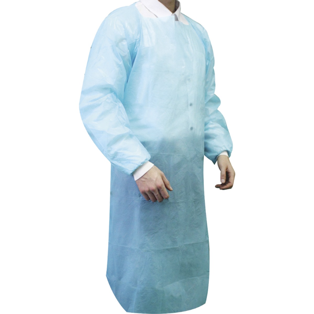 Material : Polietileno Talla : Universal Color : Azul Empaque : Bolsa de 10 unidades Certificaciones : CE / ISO 9001 Características : – Con amarras, mangas y puño de algodón.