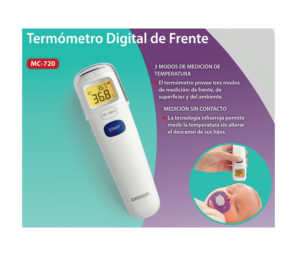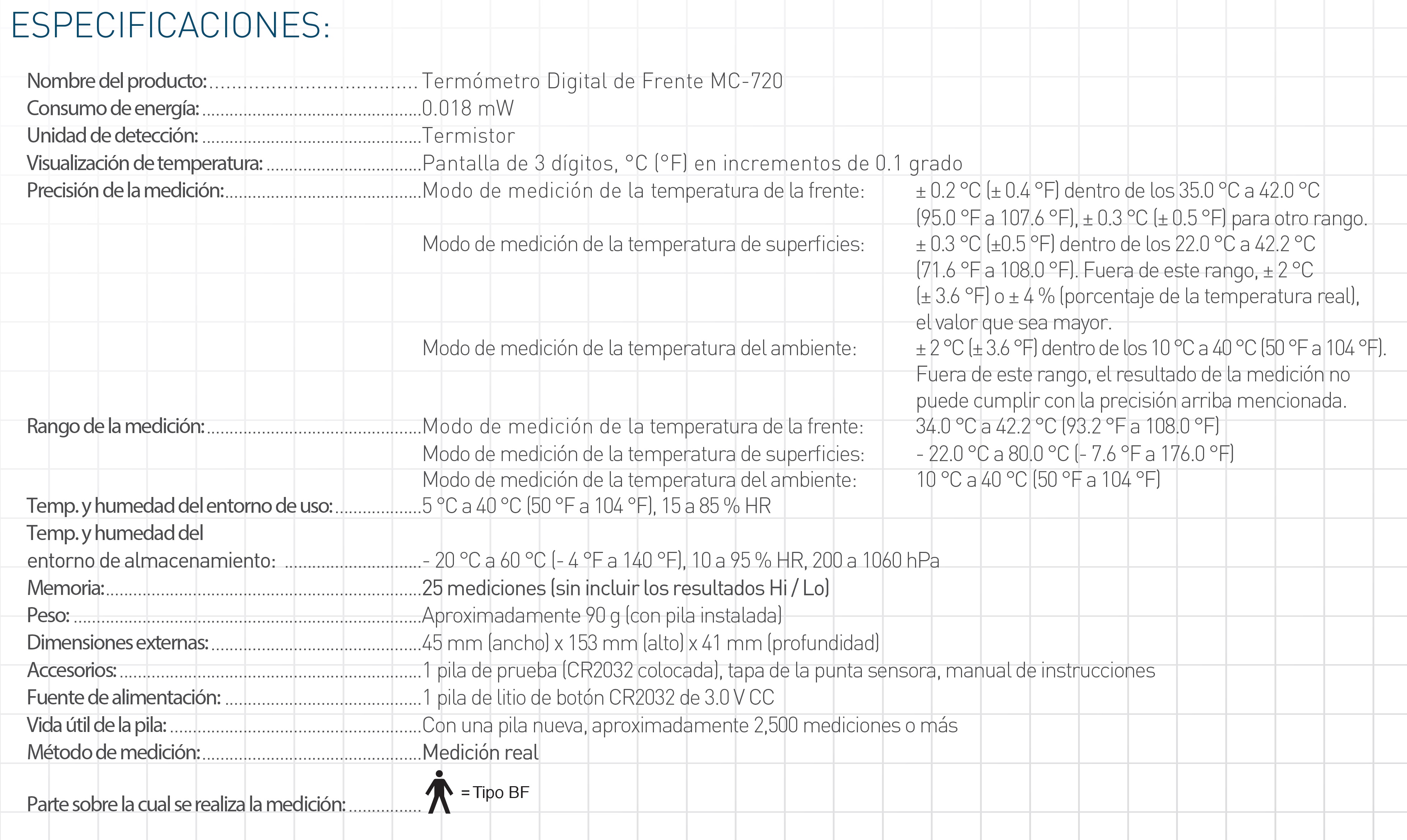 El termómetro digital de frente MC-720 utiliza una tecnología de alta precisión y tiene características avanzadas tales como la medición en un segundo, lecturas seleccionables en grados centígrados / Fahrenheit y visualización de la temperatura ambiente antes de apagarse. Para ayudar con las lecturas en la oscuridad, el dispositivo también tiene la función de luz de fondo.